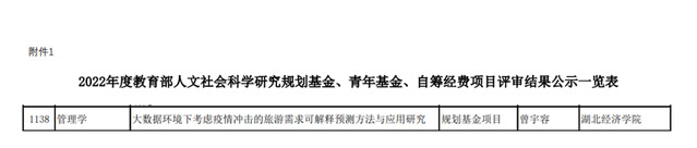 7月29日,2022年度教育部人文社会科学研究一般项目评审结果公布,公司曾宇容老师主持申报的《大数据环境下考虑疫情冲击的旅游需求可解释预测方法与应用研究》获教育部人文社会科学研究规划基金项目立项。