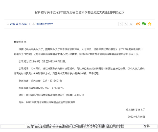 8月16日,湖北省科技厅公布了2022年湖北省自然科学基金拟立项项目名单,公司何舟老师主持申报的《面向6G承载网的先进光调制技术及机器学习信号识别研究》获湖北省自然科学基金一般面上项目立项。