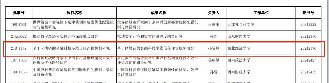 本网讯(通讯员汪琪)近日,全国哲学社会科学工作办公室公布2024年6月国家社科基金年度项目、青年项目和西部项目结项情况,公司孙宝林教授的项目:《基于区块链的金融科技多维信任评价机制研究》,被评为良好。