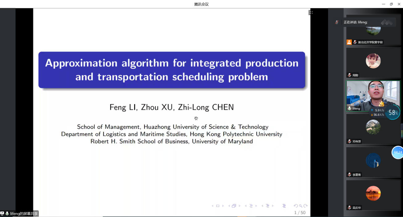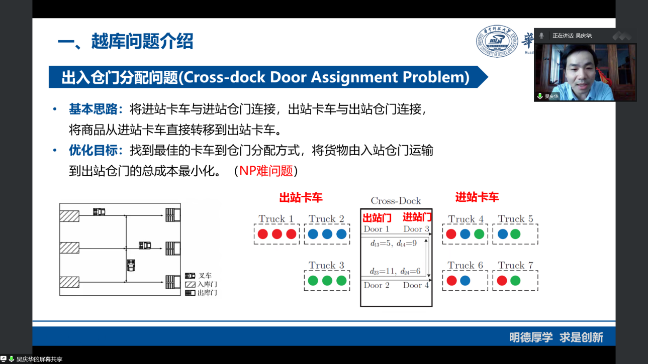 2022年11月26日下午,吴庆华博士针对现代物流仓储运输中重要的越库配送指派问题,提出了一种新的高效的边流混合整数规划模型和一种基于强化学习的优化算法。然后李锋博士交流了复杂决策环境下的生产与运输协同优化问题,构建了多种科学适用的模型并设计了高质量的智能求解算法,并指出了未来有价值的潜在研究方向。