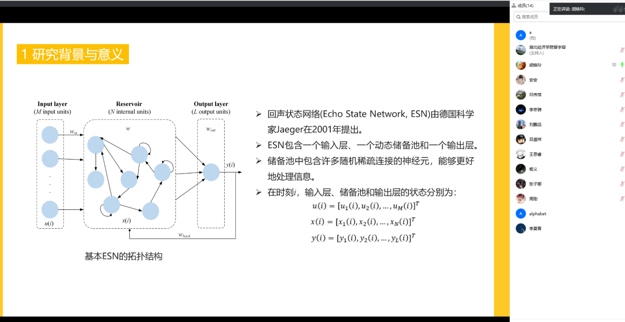 2022年11月27日上午,吕盛祥博士围绕复杂时间序列预测问题,分享了在《Information Sciences》发表的选择性集成建模方法与应用。接下来胡焕玲博士交流了“基于改进回声状态网络的能源预测问题”的相关研究,具体内容包括基于深度ESN的能源消费量和风力发电量预测、基于Bagging的DE优化ESN集成的能源消费量预测和基于VMD和DE优化ESN的风速预测等内容。另外,王思睿博士就求解联合补货-配送协同优化问题的高质量算法设计问题分享了论文写作技巧。