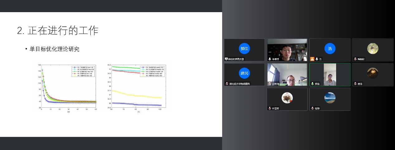 随后,郭佳老师以“自适应进化算法在单目标优化问题的中的应用”为题作报告,重点分享了一种动态分组的粒子群算法,对该算法原理及效果进行了详细的介绍;并对该项研究的成果进行了展望。