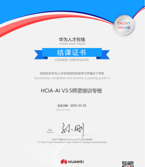 本网讯(通讯员:张棋飞)2025年3月1日~2日,华为联合“信息技术新工科产学研联盟”举办了人工智能专题团队培训,内容涉及人工智能概述、机器学习、深度学习、人工智能开发框架等。此次培训面向高校人工智能专业教师,内容聚焦人工智能前沿技术,采取理论与实践相结合的培训模式,以理论内容搭配实验案例进行操作,保障培训教师深入理解新技术知识。公司人工智能导论课程组选派老师全程参与了此次培训并顺利通过考核,获得了华为HCIA-AI培训认证。
