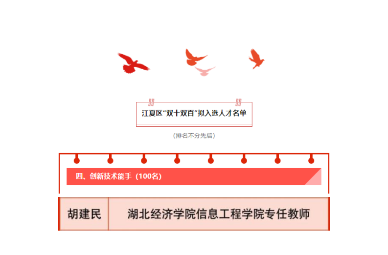 本网讯(通讯员:梅晟尧)近日,武汉市江夏区委人才工作领导小组办公室下发通知,公示入围江夏区“双十双百”人才名单,公司胡建民老师入选,获评“创新技术能手”称号。
