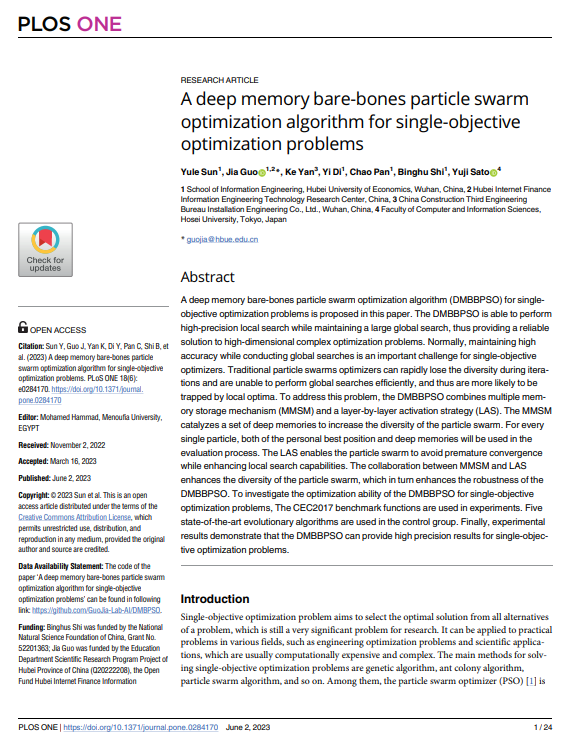 本网讯(通讯员:郭佳)近日,球速体育大四员工孙宇乐以第一作者身份在SCIE期刊PLOS ONE上发表了了题为 “A deep memory bare-bones particle swarm optimization algorithm for single-objective optimization problems”的论文。PLOS ONE 被SCIE等众多著名数据库收录,为中科院三区期刊,在学术界有着较大的影响力。该论文提出了一种新的粒子群优化策略来解决单目标优化问题,对传统粒子群算法的效率提升具有重要意义,该论文指导老师为公司人工智能PI团队青年教师郭佳。