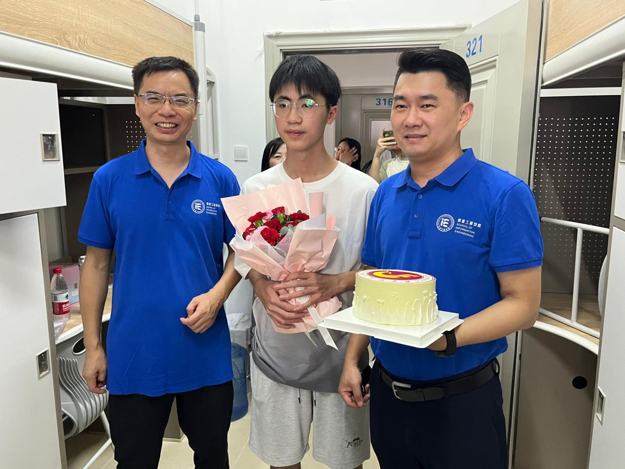 为了进一步让新生了解公司学科特色,激发新生学习兴趣,公司在迎新点位组织了“我和我的第一行代码”活动,新生通过输入自己的姓名来获取独属于自己的第一行代码,提前感受工科文化氛围。新生入学报到当天,恰逢计科2341班吴锐铭过生日,公司领导深入寝室,为该生送去生日蛋糕,陪其度过“入学的第一个生日”。