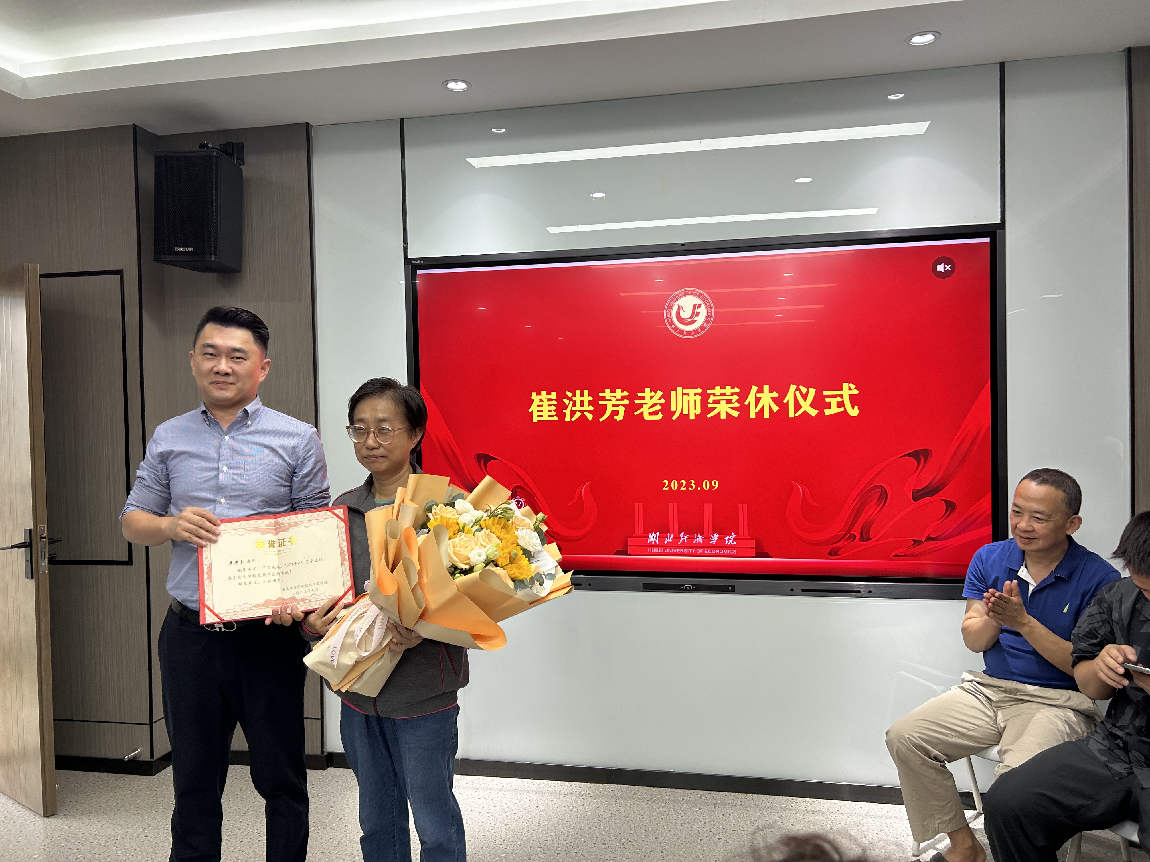 最后,经理田浩为崔洪芳老师献上献花与荣休证书,祝愿崔老师能有一个幸福、充实的退休生活。