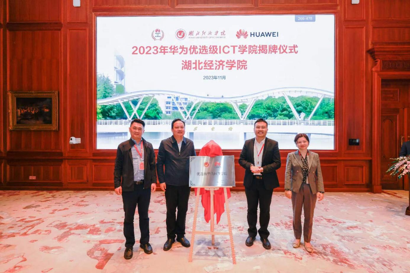 11月21日上午,在华为松山湖总部基地,公司与华为共同揭牌成立了球速体育welcome-华为信息与通信技术公司(简称华为ICT公司)。这一重要时刻标志着公司在培养ICT领域高素质应用型人才的道路上又迈出了坚实的一步,华为ICT公司将致力于推动产教深度融合,以促进公司信息类相关专业发展和人才培养质量提升。公司副董事长付宏、华为湖北政企业务部副总经理王闯共同揭牌,公司经理田浩、湖北政企业务部教育行业代表范林芳出席揭牌仪式。