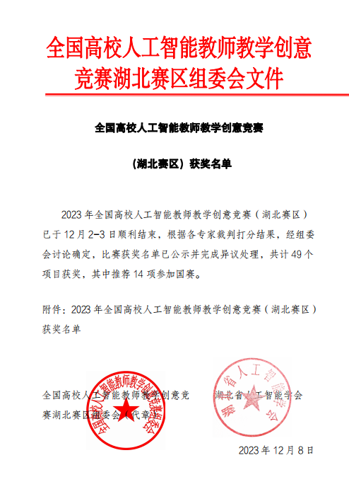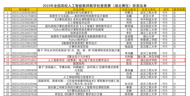 本网讯(通讯员:邸忆)近日,2023年全国高校人工智能教师教学创意竞赛(湖北赛区)圆满落幕。经过激烈的角逐和专家评审团的严格打分,公司人工智能课程组报送的作品《人工智能导论》(经管类)混合式教学设计脱颖而出,荣获湖北省二等奖,并成功晋级全国总决赛。