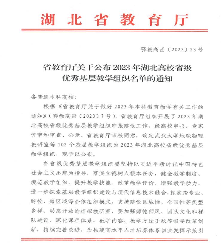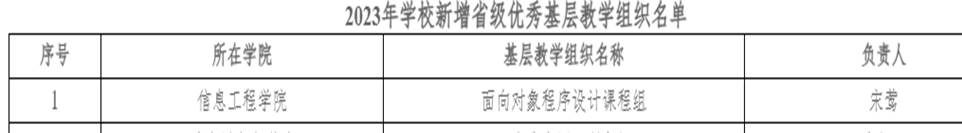 本网讯(通讯员:宋莺)近日,湖北省教育厅发布《2023年度省级优秀基层教学组织认定结果的通知》(鄂教高函〔2023〕23号),认定公司“面向对象程序设计课程组”团队为2023年湖北高校省级优秀基层教学组织。