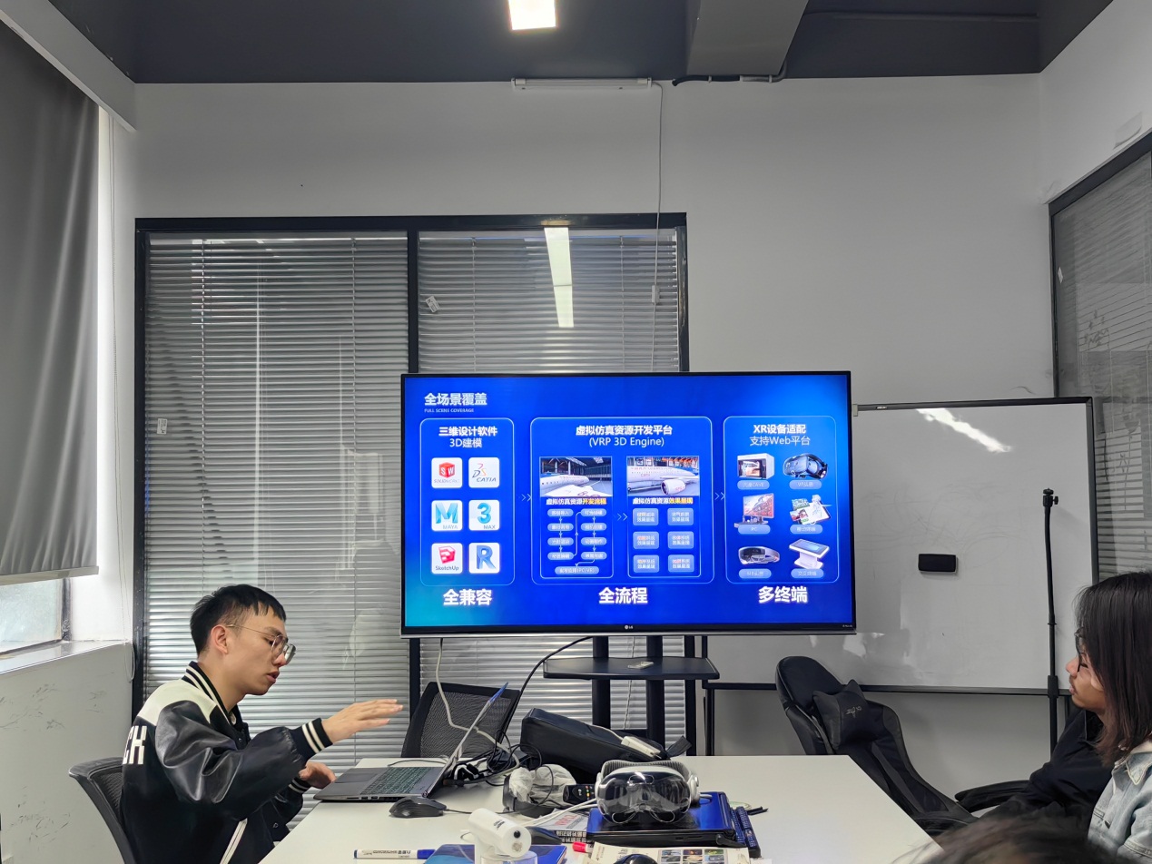 然后由产品经理陈经理介绍了目前国内外的三维设计软件的基本情况。以及目前在智能制造,各行各业的数字化转型的大背景下,虚拟现实技术的应用场景。并以一个工业仿真项目建设的详细过程为例给大家做了详细的介绍。让同学们了解了从项目规划,产品设计,工艺仿真,生产制造,营销运维整个过程。并通过他们公司实际完成的实例让员工知道应该学习哪些相关技术。